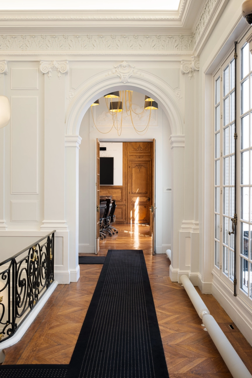Dès l’entrée, l’atmosphère haussmannienne dialoge avec des interventions contemporaines : salles de réunion lumineuses, espaces collaboratifs sophistiqués, zones de concentration, et mobilier sur mesure.